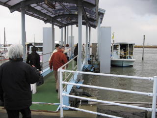 乗船中 | 有明海に出航する船に乗り込む様子です。海苔畑の見学、有明海で取れたイイダコでタコヤキつくりを体験します。 |