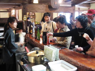 試飲中 | 昼食は大川の地酒メーカー若波酒造で頂きました。この写真は試飲の様子を撮影したものです。美味しいお酒をその造り酒屋で頂くのは旅の醍醐味でもあります。 |