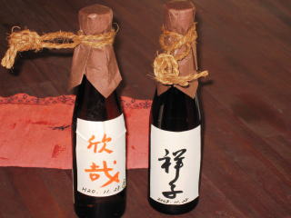 自分だけのオリジナルボトル | お酒の説明のあと、自分だけのラベル作りを体験していただきました。無地のラベルに、皆さん思い思いの文字を書かれ、世界でただ1本のオリジナルボトルの完成です。 |