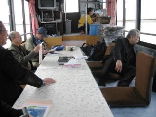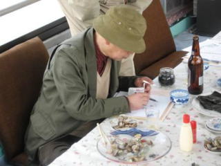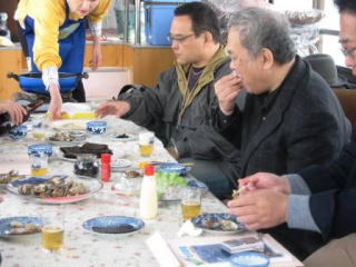 | 川の説明を受けながら、船から見える筑後川昇開橋をはじめとした風景を楽しむ嵐山・筒井両氏 | 地元有明海で獲れた海苔やアサリ貝などの食材を使った料理にご満悦の様子 | |
