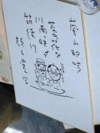 | 筑後川クルーズを満喫された後、最後に嵐山氏、筒井氏共同で、こんな色紙を描いていただきました。 | ||