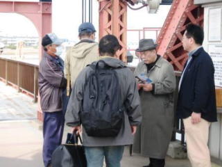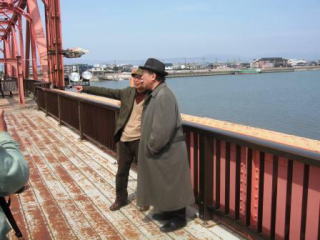 | 佐賀出身の筒井氏より、遠くに見える長崎県雲仙・普賢岳の輪郭を教えられる嵐山氏。(筑後川昇開橋より) | 筑後川昇開橋の管理者から、橋の説明を受ける嵐山氏 | |