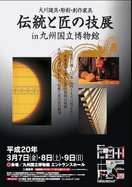 大川建具・彫刻・創作家具 伝統と匠の技展 が九州国立博物館で開催されます。 期間は3月4日から9日までです。 (ポスターでは3月7日から9日までとなっていますが日程が延長になっています) この機会に九州・大川で培われた伝統と匠の技に触れてみませんか。