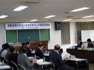 平成19年7月13日(金)に大川商工会館にて「高校の進路指導の先生と会員事業所との意見交換会」が開催されました。 企業側からは家具、建具、イ製品、金属、医療関連など14事業所、高校側からは大川・柳川・大牟田・久留米・八女・佐賀市などにある20の高校の先生が出席されました。 企業側から見た、企業が求める人材、学校側からは、就職した後の生徒を育てていくための企業側の対応などについて意見交換が行われました。 |