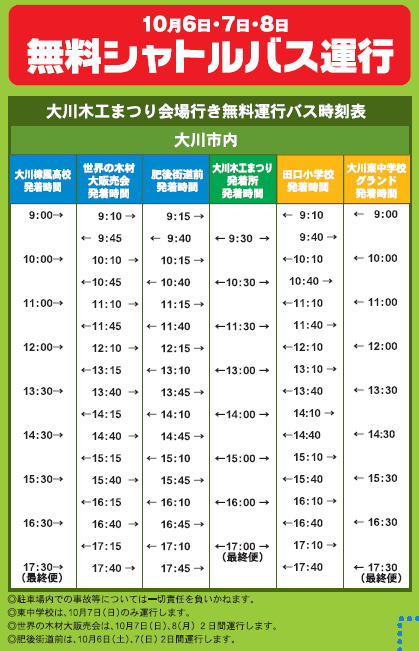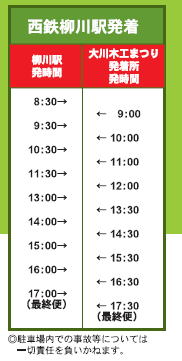 | 会場と周辺駐車場、西鉄柳川駅の間を無料バスが運行しています。無料バスの運行時間は下記にあります。 |