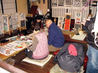 | 肥後街道祭りの灯篭を作っている人を訪ねました。 寿さん、灯篭の作り方を一生懸命きいています。 |