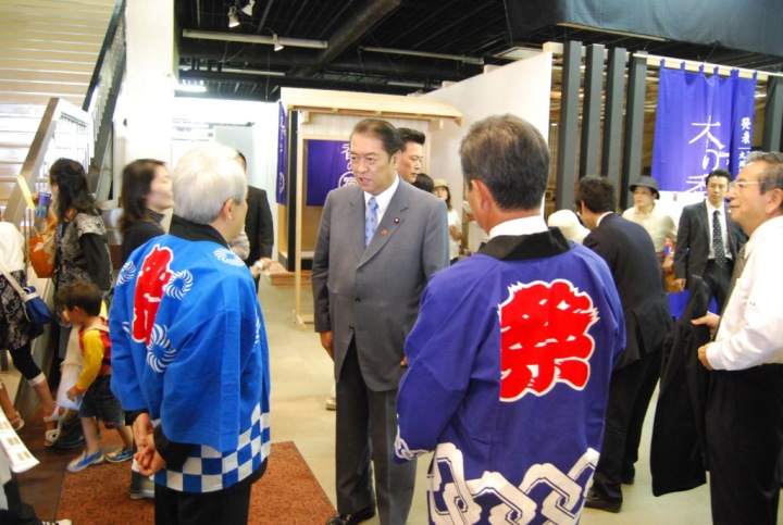 | お客様来訪 | 鳩山総務大臣も木工まつりにいらっしゃいました。木工まつりの実行委員長を務める植木大川市長と木工まつりの盛り上がりの様子についてお話をされていました。 | |