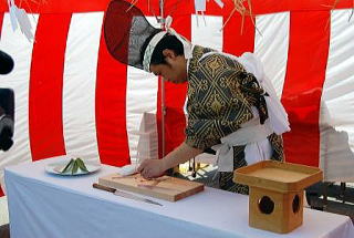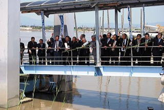 5月1日(金)に筑後川でのエツ漁の解禁にあわせ、エツの豊漁と遊覧船の安全運航を祈願するための「大川エツ観光川開き」が大川市小保にある若津港浮き桟橋で行われました。 全国でも有明海だけに生息する『エツ』。エツはカタクチイワシ科の魚で、産卵のため有明海から筑後川をのぼってくる5月から7月までがシーズンです。新鮮なエツの刺身やバラエティーに富んだ料理は、多くの食通に喜ばれています。 エツ料理は、鮮度を特に保つ必要があるために、地元の料理店で味わうのが一番と言われてます。初夏の味を楽しみませんか? (筑後川でのエツ漁解禁は、5月1日から7月20日までです) 神事にあわせて包丁はじめが行われました。 エツをおろし、神様にささげます。 |