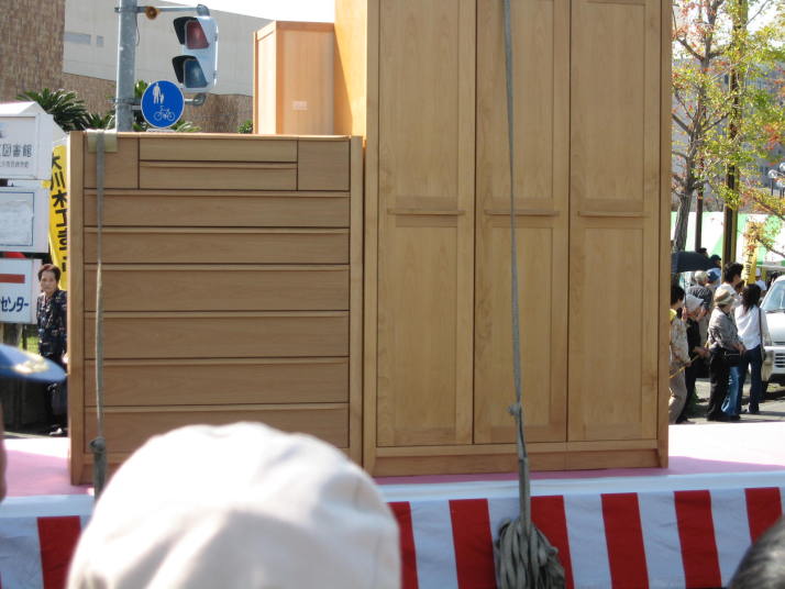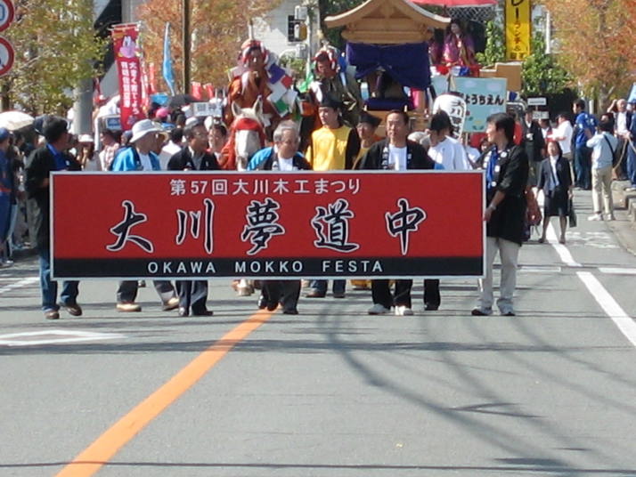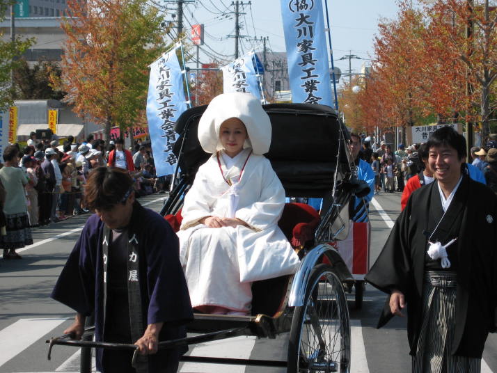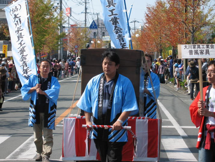 | 第57回大川木工まつりが10月6日(金)〜8日(日)の期間に開催されました。今年の木工まつりは3日間とも好天に恵まれ、多数の方が来場され、賑わいをみせました。メーン会場である産業会館では、家具・建具等の展示即売会が行われ、掘り出し物を求めるお客様で活気を催していました。 8日(日)には、大川”夢”道中が行われました。大川"夢”道中は、大川の昔の花嫁入りを再現したもので、沿道の人々が、その様子を非常に興味深く見つめていました。 平成19年の木工まつりは10月5日(金)〜7日(日)に開催の予定です。皆様のご来場をお待ちしております。 |